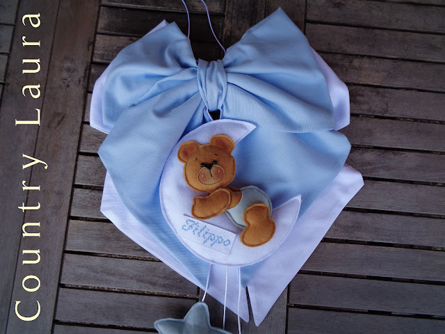 Per lui ho creato questo doppio fiocco in cotone piquet con orsetto, luna e stelline in morbido pannolenci.